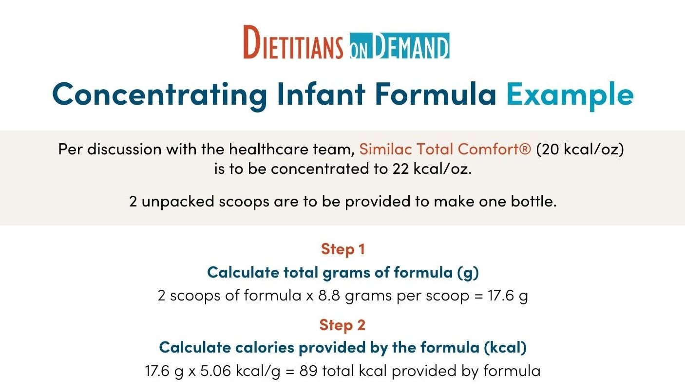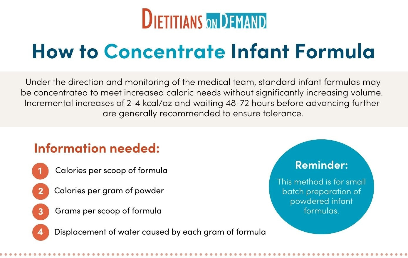 Whether you're a seasoned RDN or a dietetic intern in a pediatrics rotation, this is a great 2-page infographic to keep on hand. This straightforward resource provides step-by-step guidance for the calculations involved in concentrating a powdered infant formula. And, it even includes an entire example page! Download now so you're prepared for the next time you need to manually calculate a concentrated infant formula.